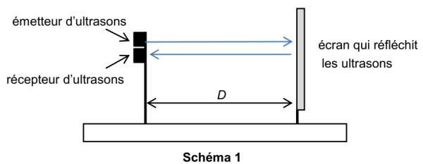 Un émetteur envoie un signal ultrasonore qui est réfléchi par l’écran et renvoyé vers un récepteur. Un appareil mesure la durée de l’aller-retour t entre l’émission et la réception du signal ultrasonore. D est la distance entre le système à ultrasons et l’écran.
