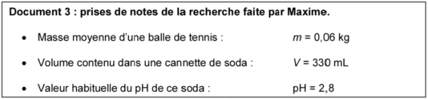 1) Dans le document 3, quelle information recueillie par Maxime lui permet de faire l'hypothèse que le soda est une boisson acide ? Justifier la réponse.