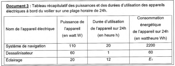 Montrer que l'énergie E1 consommée par l'éclairage du bateau sur une plage horaire de 24h