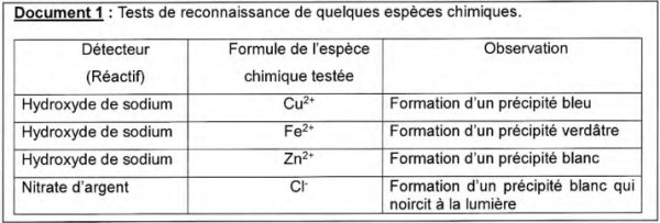 1.2. À l'aide du document 1, décrire la mise en oeuvre d'un test simple permettant de détecter la présence de l'espèce chimique Cl- dans l'eau de mer et indiquer le résultat attendu. Il est possible de faire un schéma.