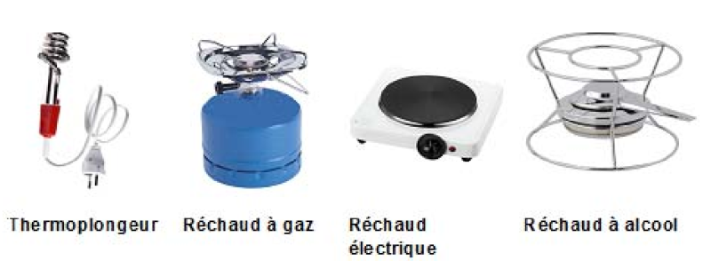 Pour chauffer de l’eau, on peut utiliser différents appareils : un thermoplongeur, un réchaud à gaz, un réchaud électrique, un réchaud à alcool.
