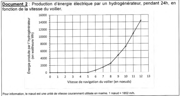 À l'aide du document 2, indiquer à partir de quelle vitesse de navigation du voilier, en noeuds, l'hydrogénérateur produit de l'énergie électrique.